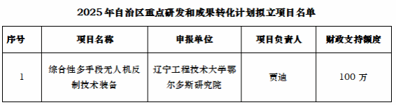近日,内蒙古自治区科学技术厅公示了2025年度重点研发和成果转化计划立项名单,研究院科研攻关取得新进展,贾迪教授主持的"综合性多手段无人机反制技术装备"项目,经过严格评审,成功入选内蒙古自治区重点研发与成果转化计划,标志着研究院在低空安全技术攻关方面实现了新的跨越。