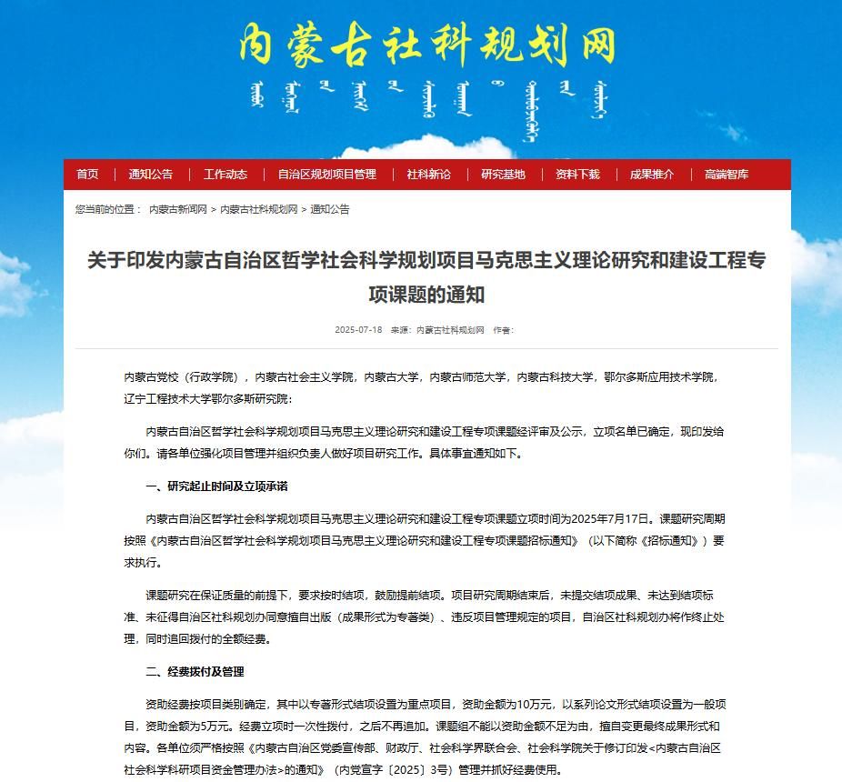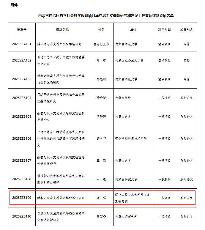 近日,内蒙古自治区哲学社会科学规划项目马克思主义理论研究和建设工程专项课题评审结果正式公布,辽宁工程技术大学鄂尔多斯研究院的富强老师凭借深厚的学术积累和卓越的研究能力,成功获批该专项课题的一般项目,研究成果将以系列论文形式呈现。这一喜讯不仅为研究院在社科研究领域再添佳绩,也彰显了研究院在推动学术进步方面的积极成效。