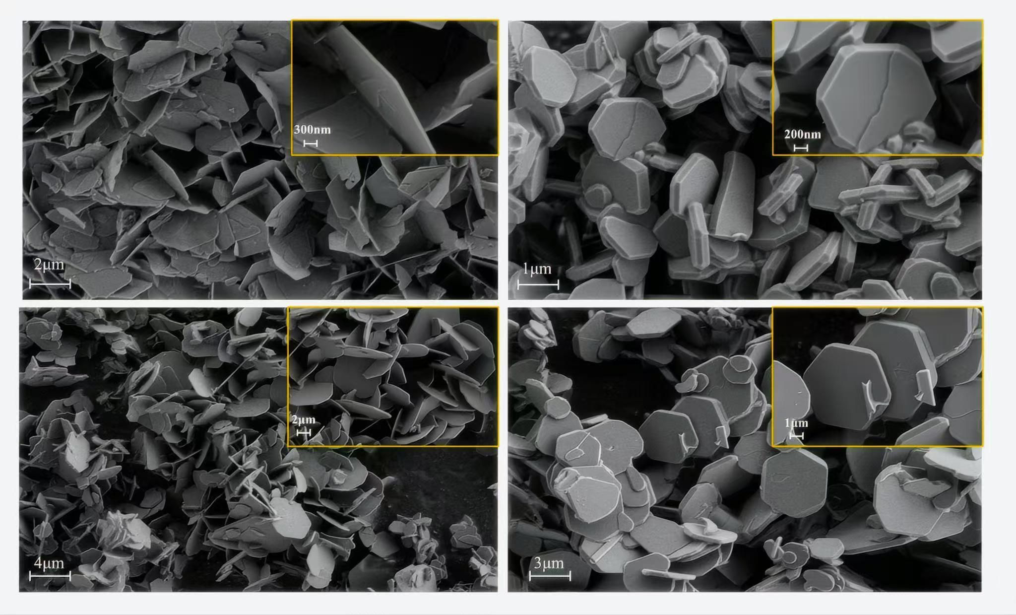 通过优化一步烧结法工艺参数,成功以预处理煤基固废为原料,制备出直径1-8 μm、厚度0.05-1 μm的六边形片状氧化铝。扫描电镜(SEM)分析表明,产物形貌完整,晶体发育良好,且径厚比可调控。与传统方法相比,该工艺具有流程短、能耗低及产品形貌可控等显著优势。