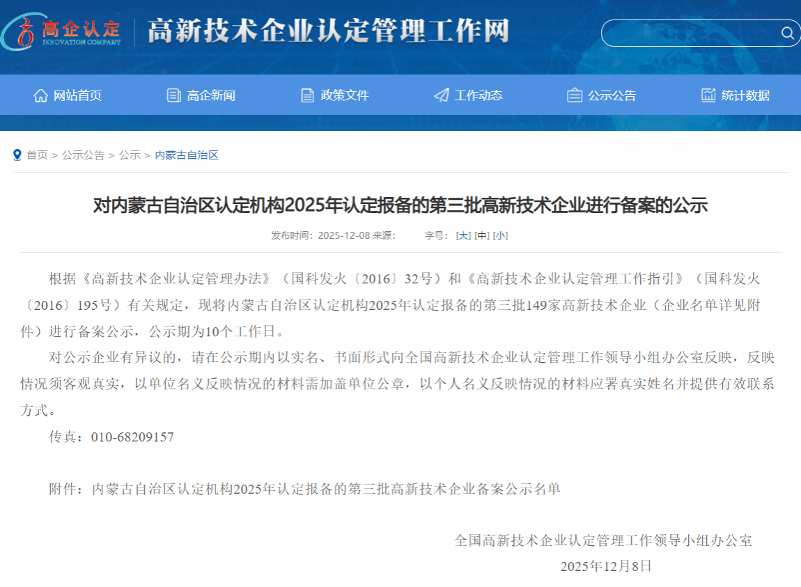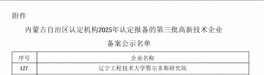 12月8日,全国高新技术企业认定管理工作领导小组办公室发布了《对内蒙古自治区认定机构2025年认定报备的第三批高新技术企业进行备案的公示》。辽宁工程技术大学鄂尔多斯研究院顺利通过国家高新技术企业认定,进入备案阶段。这一评定结果,是对研究院在核心自主知识产权、科技成果转化能力、研发组织管理水平、成长性指标及人才结构等方面的综合评估与权威认可。