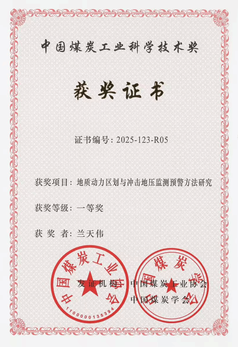 研究院副院长兰天伟参与的《地质动力区划与冲击地压监测预警方法研究》科技成果获中国煤炭工业协会科学技术一等奖,科研团队负责人郭春彬副教授牵头完成的《粉煤灰多组分高附加值利用关键技术研究与应用》科技成果获中国煤炭工业协会科学技术奖二等奖。两项成果展现了研究院在煤矿冲击地压和固废资源化利用与绿色矿山建设领域的创新贡献。