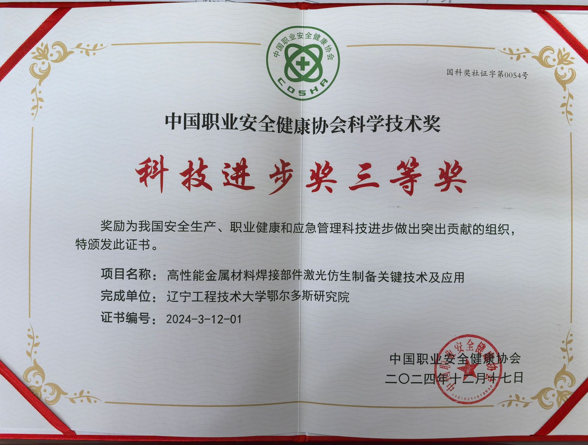 中国职业安全健康协会科学技术三等奖